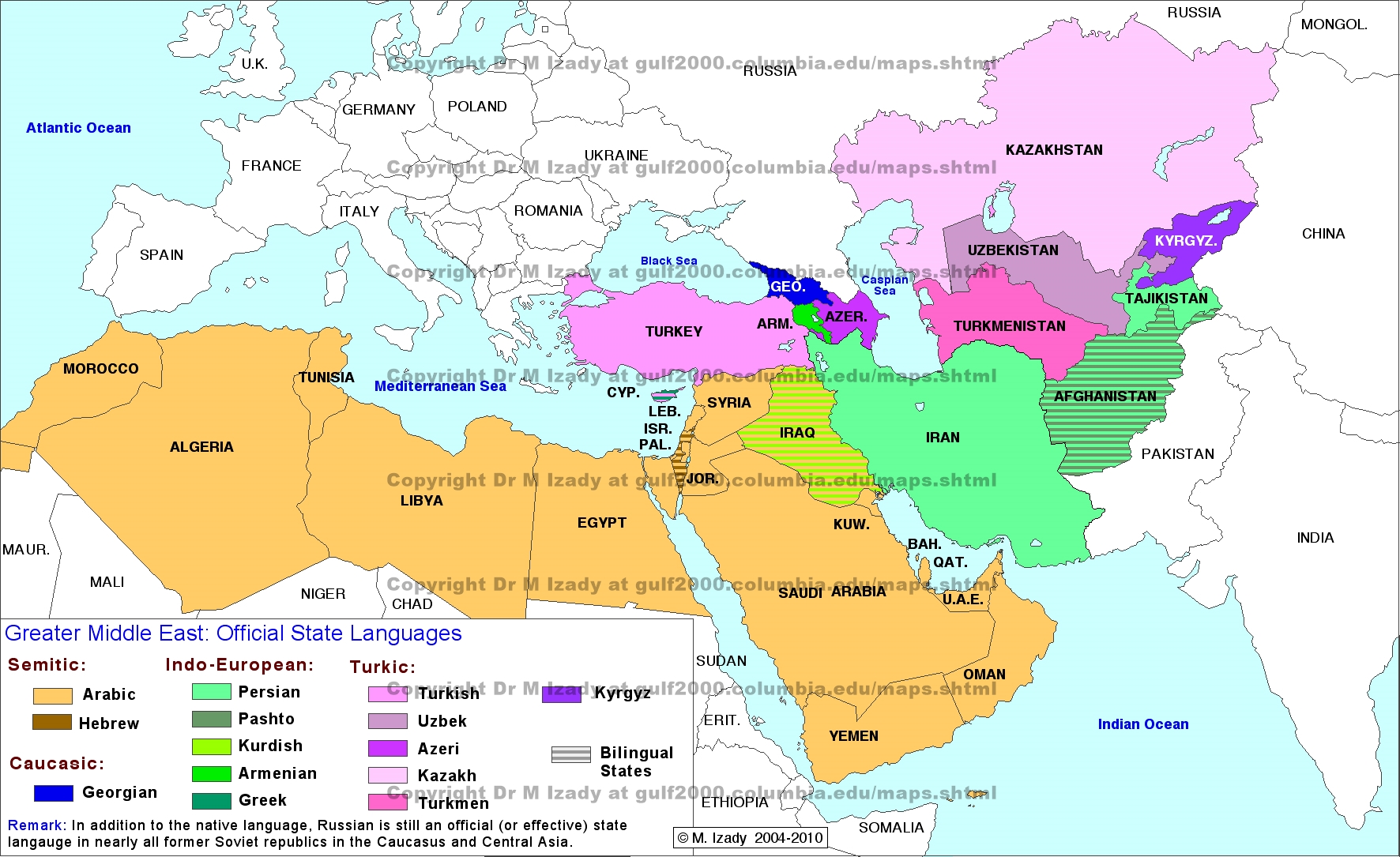 Afghanistan, Languages (detailed)Afghanistan, Languages (summary)Caucasus and Vicinity, Ethno-Linguistic GroupsCaucasus, Ethno-Linguistic Makeup (summary)Caucasus, Ethno-Linguistic Makeup (detailed)Caucasus, Linguistic GroupingCentral Asia, Languages (summary)Central Asia and Vicinity, LanguagesGreater Middle East, Official State LanguagesHoly Land (Israel, Jordan, Palestine), Languages (detailed)Holy Land (Israel, Jordan, Palestine), Languages (summary)Iran Languages (detailed)Iran, Languages in 2000Iran, Languages in 2014Iranian/Iranic Family of Languages (Summary)Iraq, Languages (summary)Islamic World, Primary LanguagesJordan, Linguistic Composition (summary)Kurdish Language and its Dialects: DistributionLevant (al-Shaam) - Syria, Lebanon, Israel, Palestine and Jordan Linguistic Composition in 2010 (summary)Levant (al-Shaam) - Syria, Lebanon, Israel, Palestine and Jordan Linguistic Composition in 2010 (detailed)Middle East, LanguagesMiddle East Language FamiliesNorth Africa, LanguagesPakistan, LanguagesPersian Gulf, LanguagesPersian Language Distribution (summary)South Sudan, LanguagesSudan (North), LanguagesSudan (formerly united), LanguagesSyria Linguistic Composition in 2010 (detailed)Syria Linguistic Composition in 2010 (summary)Turkic Languages of Middle East and VicinityYemen, Languages (detailed)