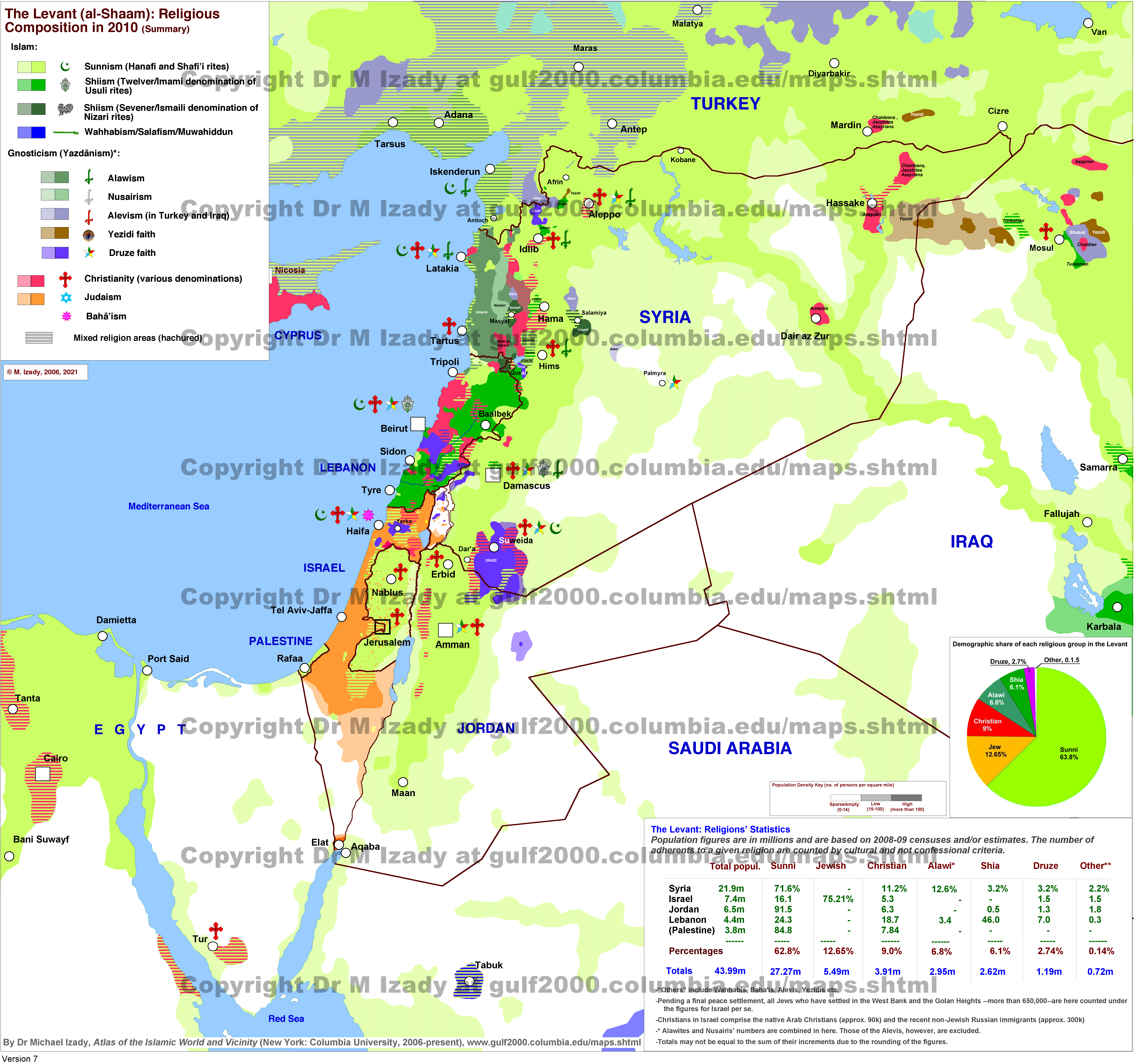 Afghanistan Religions (detailed)Afghanistan Religions (summary)Caucasus Religious CompositionCaucasus and Vicinity: Religious DiversityCentral Asia Religious CompositionCentral Asia and Vicinity Religious CompositionCentral Iraq: Changes in Ethno-Religious Composition, 2017Christian Population of Middle East in 1914Christian Population of Middle East in 2014Holy Land (Israel, Jordan, Palestine), Religions (detailed)Holy Land (Israel, Jordan, Palestine), Religions (summary)Iran Religions (summary)Iraq Religions in 2000 (summary)Iraq Religions in 2015 (summary)Islam Branches and DenominationsIslam's Branches and Denominations in the Middle EastIslam, Denominations, sects and divisions of ShiismIslam, Sunni DenominationsIslamic World Branches and Primary DivisionsIslamic WorldJordan, Religious Composition (summary)Kurdistan Religious MakeupLebanon, Ethno-Religious Composition in 1935Lebanon Religious Composition in 2010 (detailed)Lebanon Religious Composition in 2010 (summary)Levant (al-Shaam) - Syria, Lebanon, Israel, Palestine and Jordan Religious Composition in 2010 (summary)Levant (al-Shaam) - Syria, Lebanon, Israel, Palestine and Jordan Religious Composition in 2010 (detailed)Libya Religion, Western SectorMiddle East ReligionsNigeria Religions (detailed)Pakistan ReligionsPersian Gulf Religions (summary)Persian Gulf Religions (detailed)Shias in the Core Areas of the Middle EastSouth Sudan ReligionsSouthwest Arabia, The Yemen, Najran, Asir and Jazan: Ethno-Religious Makeup (detailed)Sudan (north) Religious CompositionSudan (formerly united) Religious CompositionSyria Religious Composition in 2010 (detailed)Syria Religious Composition in 2010 (summary)West Africa Religious CompositionYemen Ethnic and Religious Composition (detailed)Yemen Ethnic and Religious Composition (summary)